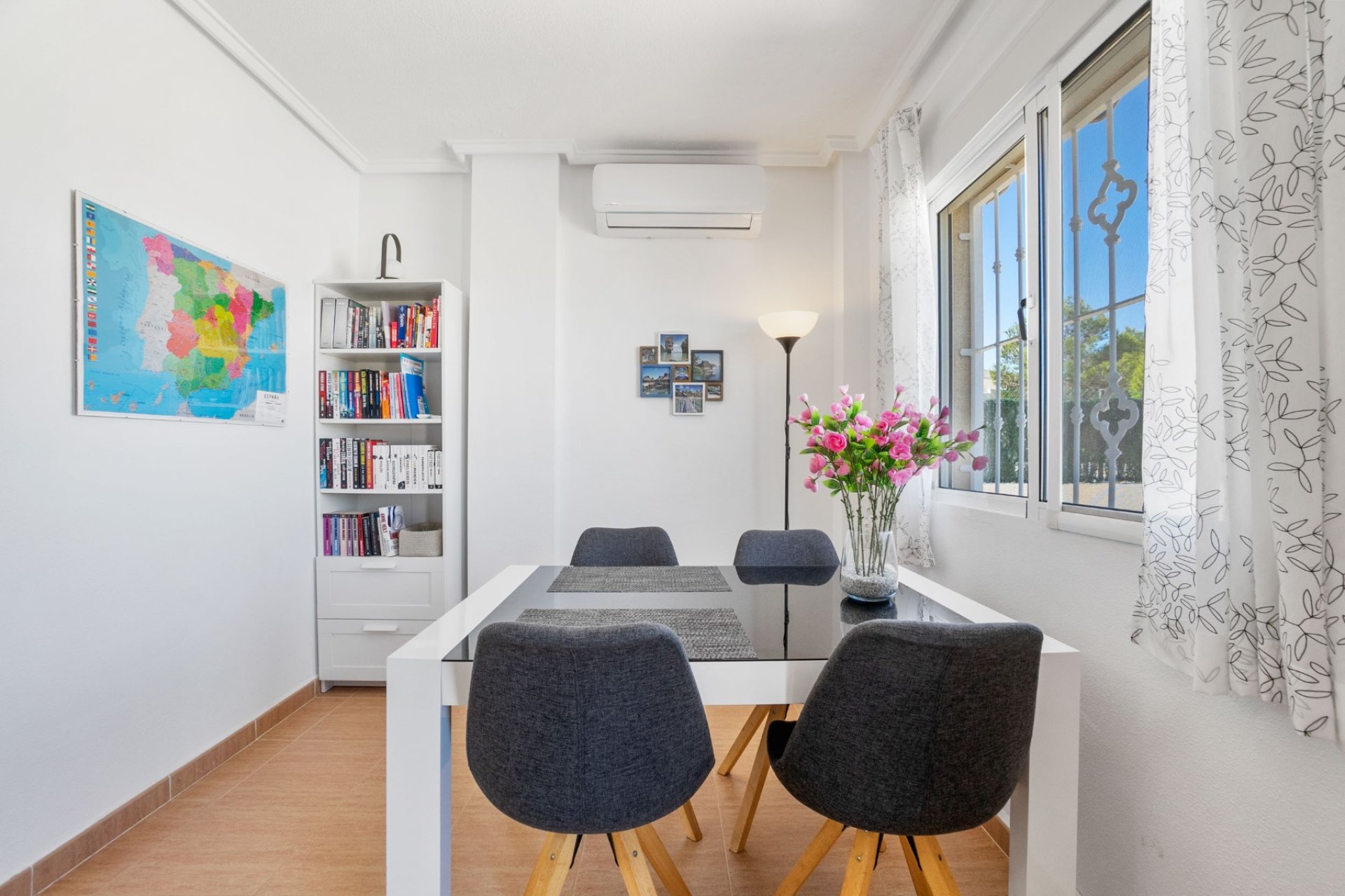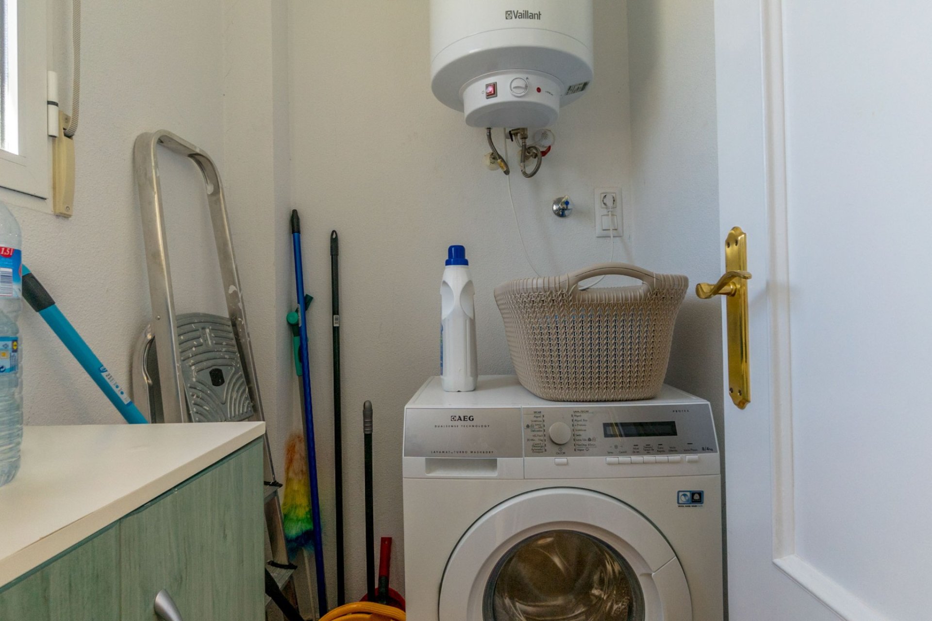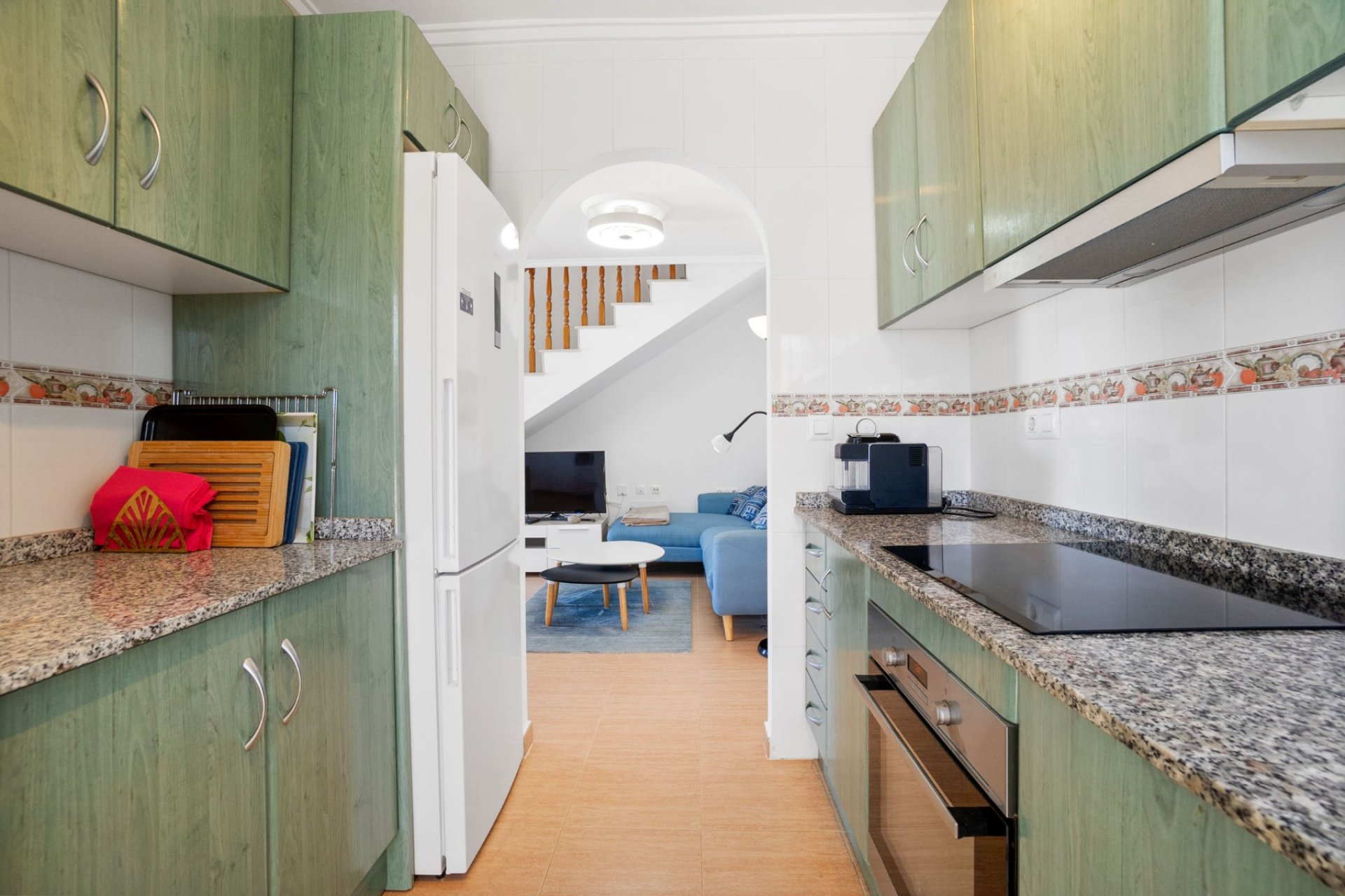 El interior de la vivienda es luminoso y acogedor, con una distribución muy funcional. En la planta baja encontrarás un amplio salón con aire acondicionado, una cocina independiente totalmente equipada, un práctico lavadero, dos dormitorios y un baño con bañera. En la planta superior se ubica el dormitorio principal, también con aire acondicionado, baño en suite con ducha y salida directa a una magnífica terraza solárium. Esta terraza está equipada con toldo y cristal en el frontal, lo que crea un espacio excepcional para disfrutar del sol y de las vistas durante todo el año.